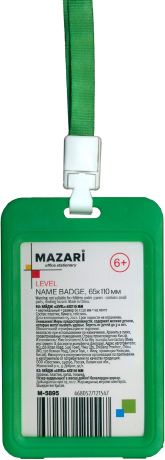 —Бейдж вертикальный LEVEL, 65х110 мм, пластик, микс цветов, М-5895