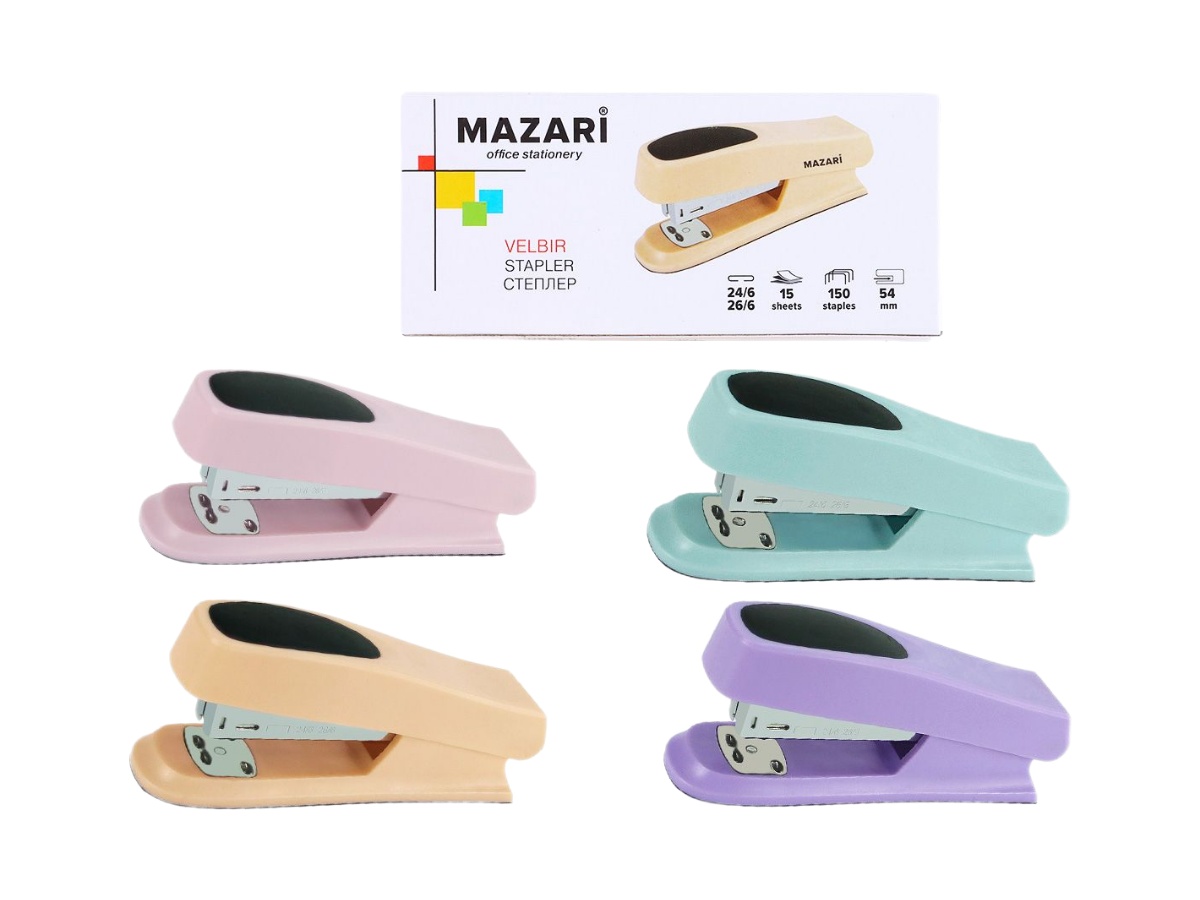 Степлер № 24;6 - 26;6, VELBIR, 15 листов, ассорти 2 цвета, пластиковый корпус, M-6928