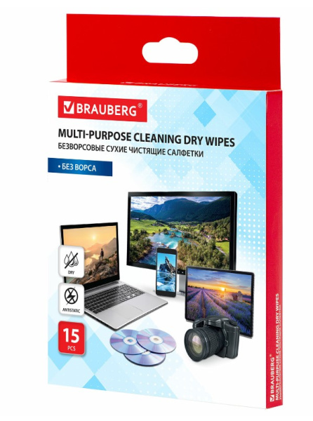 —Салфетки сухие безворсовые,BRAUBERG, Универсальные, антистатические, 15 шт, 513534
