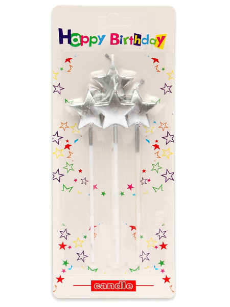 Свечи для торта на длинных пиках 'Серебряные звёзды', 4 шт., Миленд, картон. уп., европодвес, С-2465